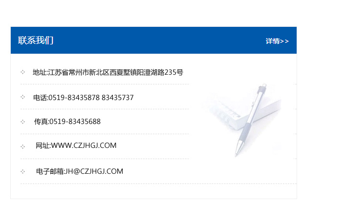 地址:常州市新北區友邦商務大廈1幢16、17層  電話:0519-85101652  傳真:0519-85112595  郵編:213022  網址:www_cz-jiayue_cn.haishen1688.com  郵箱:xiajifengaa@163.com